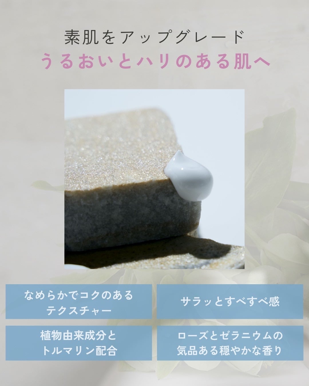 なめらかでコクのあるテクスチャーがやさしく肌になじみ、“滑りすぎず、止まりすぎない”絶妙な設計で、手のひらの感覚を心地よくサポートします。